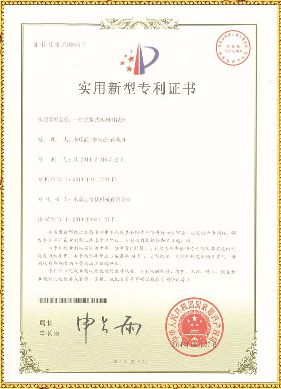 安全閥試驗臺專利證書 蝶閥試壓臺專利證書