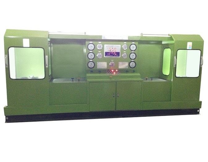 本機由液壓系統(tǒng)、機械部件,電器控制及多極氣源升壓裝置系統(tǒng)等部件組成。液壓系統(tǒng)是本試驗臺的動力主源。用于各類液壓缸和機械件驅(qū)動執(zhí)行功能。試驗面夾爪由液壓缸直接驅(qū)動執(zhí)行,軸向夾緊壓力是按閥門試驗壓力等級不同進行調(diào)節(jié)增壓(最高液壓增壓壓力31 5MPa)。各夾爪受力均,夾緊可靠。徑向移動由液壓缸傳動執(zhí)行,各夾爪進退同步,靈活自如,確保通徑大小不同閥門的測試。多極氣源升壓裝置是利用液氣聯(lián)動增壓。增壓范圍0.6—32 0MPa,用于閥門介質(zhì)壓力試驗。氣源升壓工作設有自動和手控二種操作選擇,當選用自動升壓工作時,工作人員可以近距離離開操縱臺觀察現(xiàn)場試驗情況。